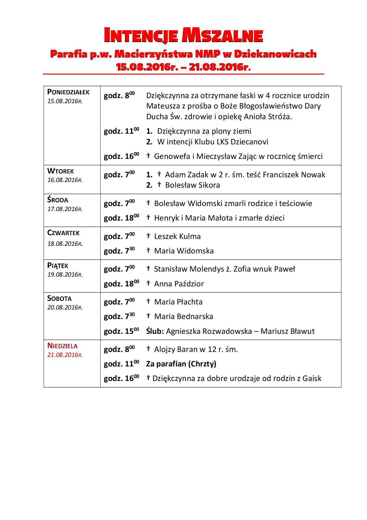 poniedziałek – Uroczystość Wniebowzięcia Najświętszej Maryi Panny.